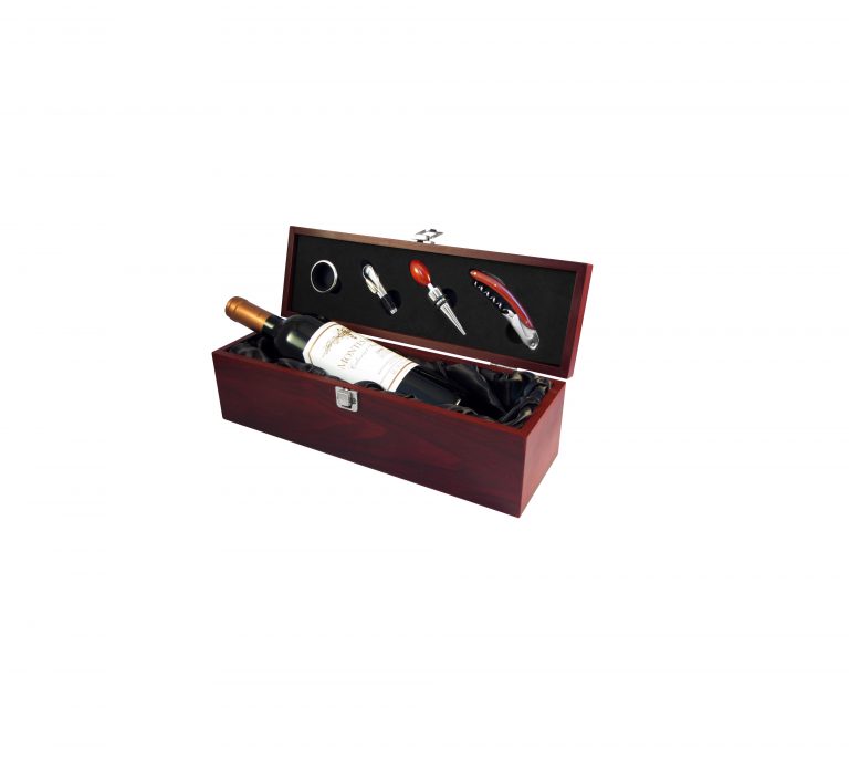Caja de madera barnizada con 4 accesorios metálicos de vino con finas terminaciones de madera. Elegante cuna satinada negra para botella.