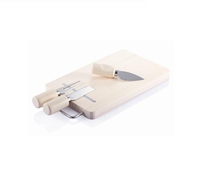 Cheese Set con 3 prácticas herramientas para quesos + tablero de madera de Hevea (Rubberwood). Incluye banda magnética sobre la tabla, para fijar las herramientas a ella.