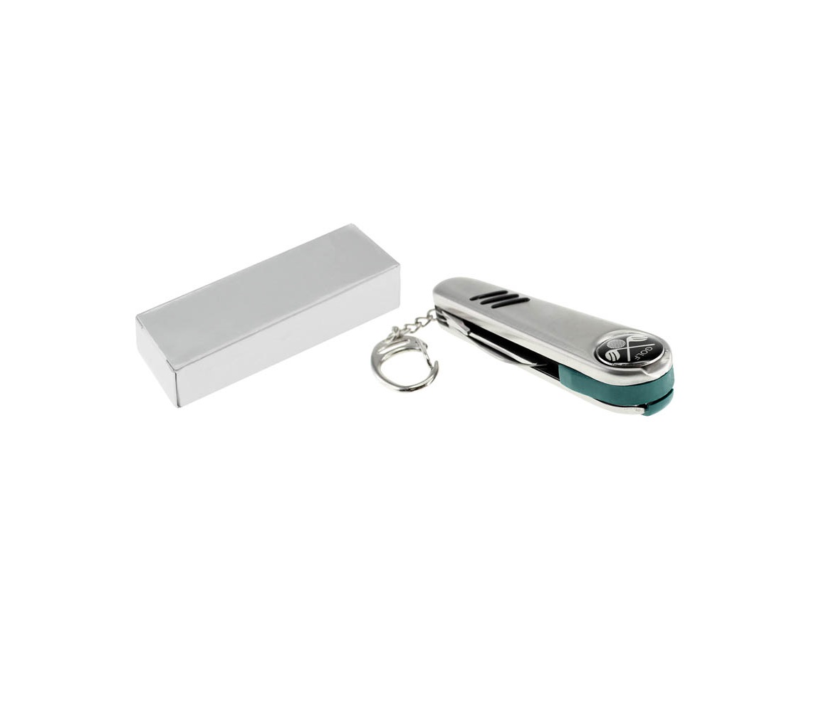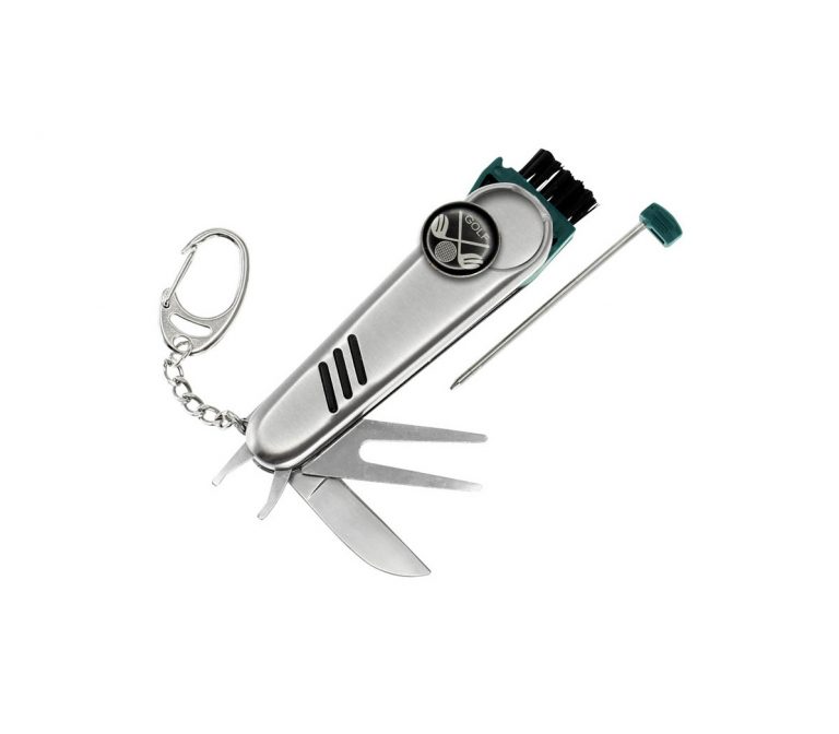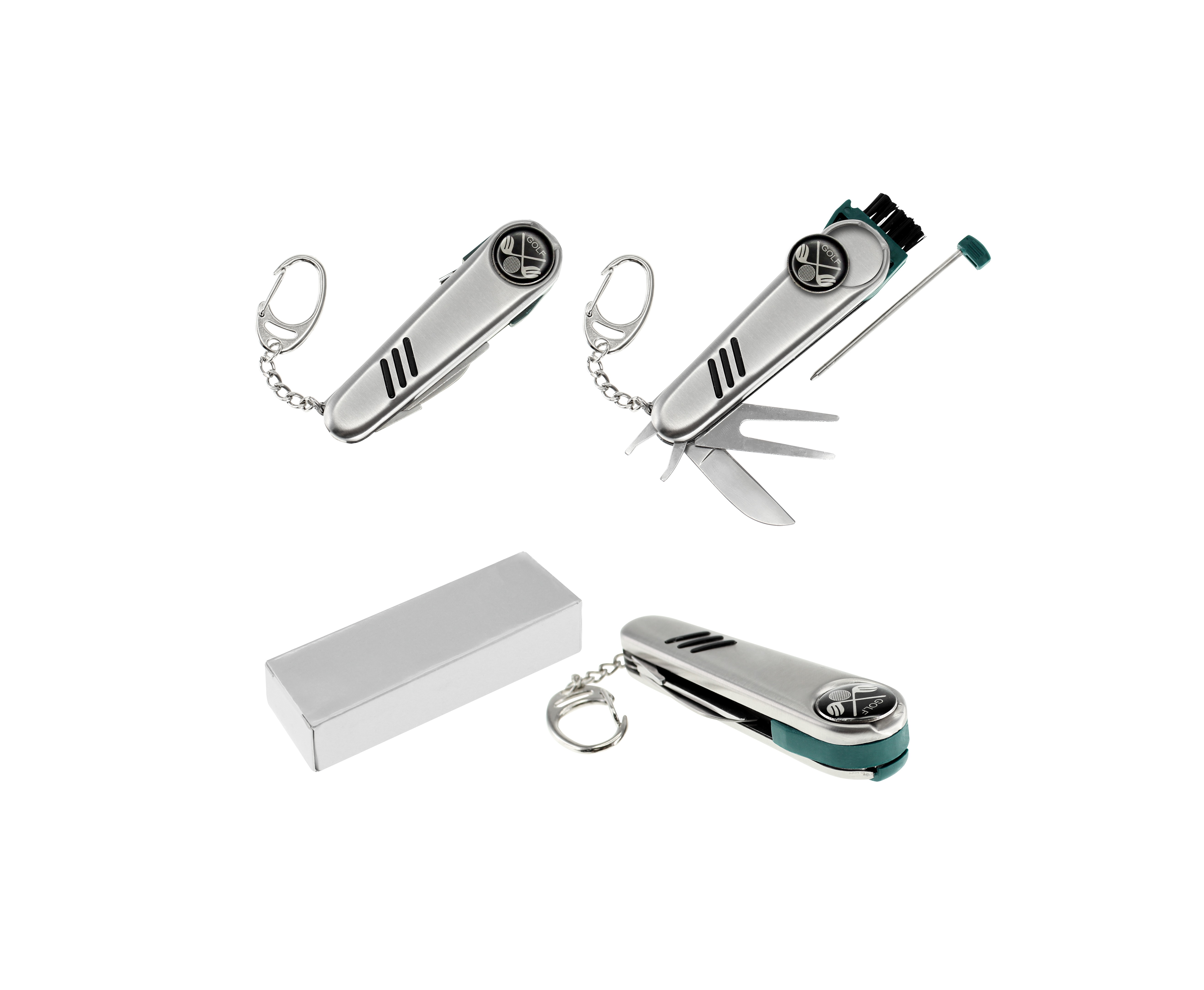 Cortaplumas de Golf de Acero Inoxidable con 7 funciones. Incluye Cuchillo, Levanta-Pique corto, Levanta-Pique largo, Cepillo, Bolígrafo tinta negra, Marcador magnético y llavero. Presentación en caja de regalo plateada.